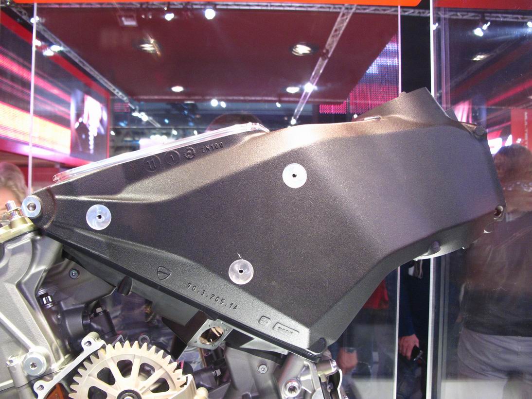 所謂的殼式的概念就像是目前小轎車的車身設計:利用板金件焊接起來一個類似於封閉形狀的殼,捨去大樑,直接連結引擎、懸吊。而DUCATI 的殼式車架則是利用鑄造的方式,打造一個中空的結構,連結引擎與前懸吊,同時還可以作為進氣箱。