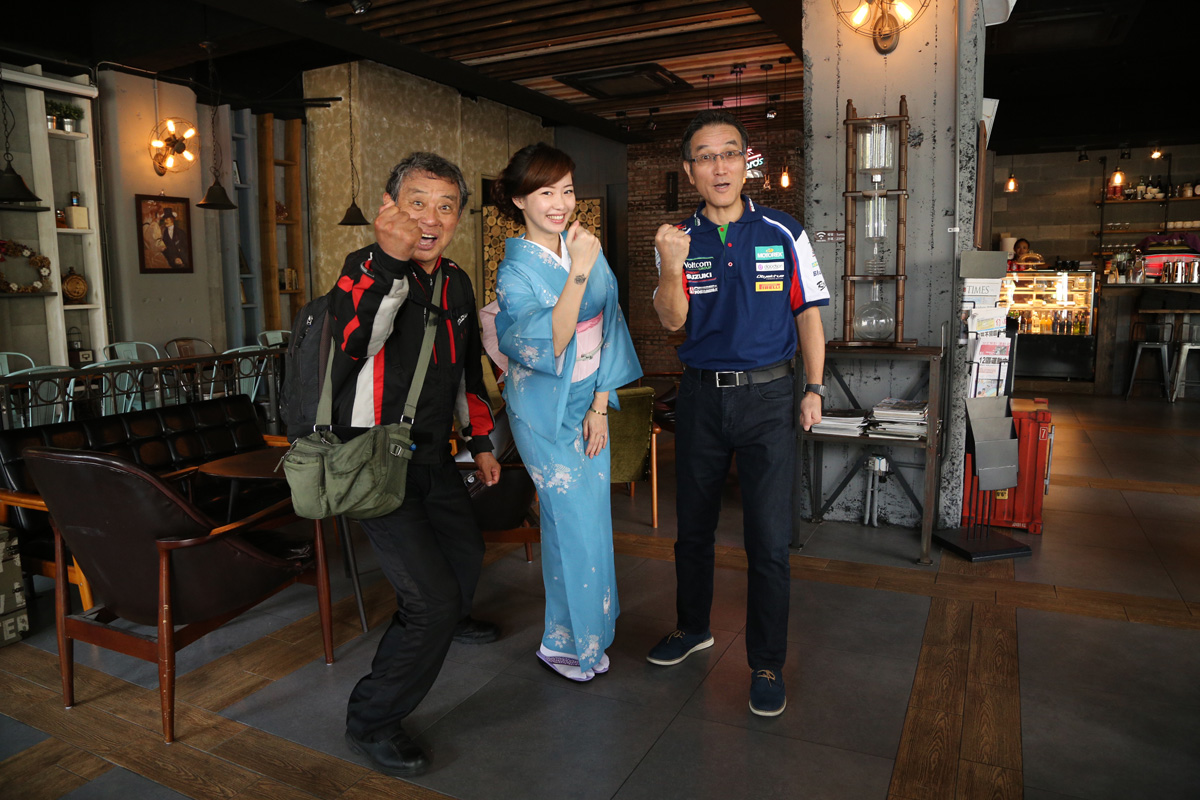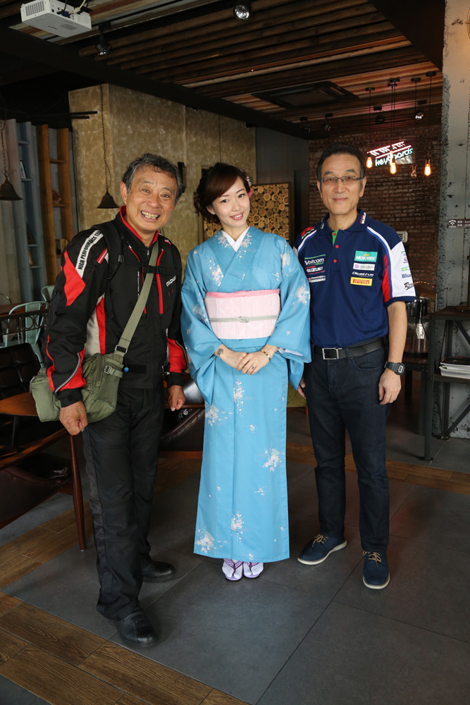招牌動作「いぐぞぉ」,穿和服的Sunny 與SUZUKI 總經理藤照博也跟著擺。