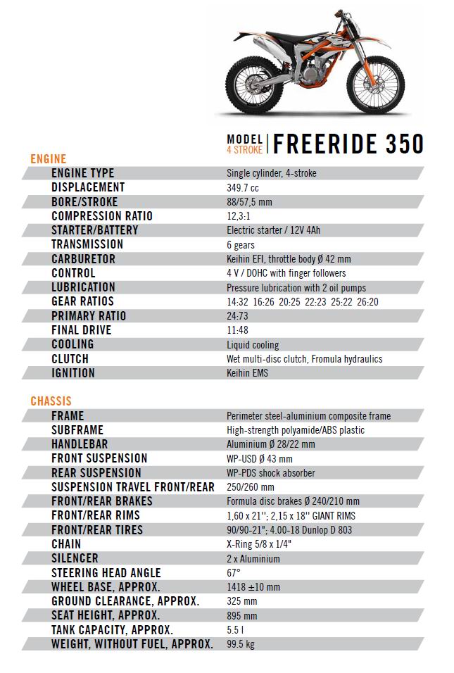 搭配350cc的四行程DOHC引擎(採2011年350 EXC-F車款上的引擎),強調重量輕巧,適合初階者進入越野騎乘的領域。FREERIDE 350整車僅有99.5Kg,23匹馬力的動力已足以做出基本的越野動作。雖然是輕型的入門車款,但依然配備有WP的前懸吊及後避震器,配色則以KTM的專用三色(橘黑白)輕鬆地搭配出亮麗的車色。