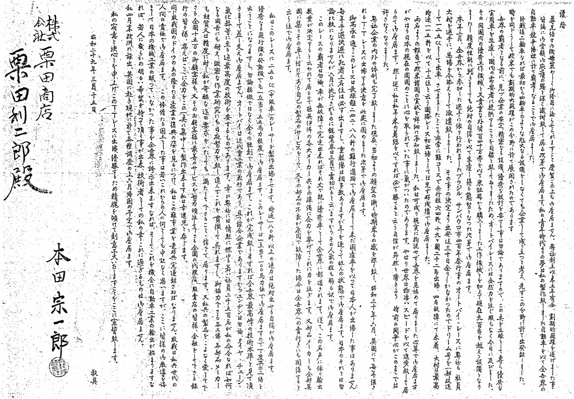 在1954年3月20日,日本未來汽車巨人的社長(當時僅成立五年)本田宗一郎寫給員工一封賽事出場宣言。除了參與世界級的賽事之外,最重要的當然是將本田的產品推到世界級舞台!