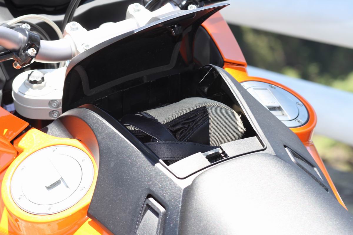 騎士前方置物空間,約可放一台類單眼數位相機進去,雙油箱設計,可獨立或開啟連通。
