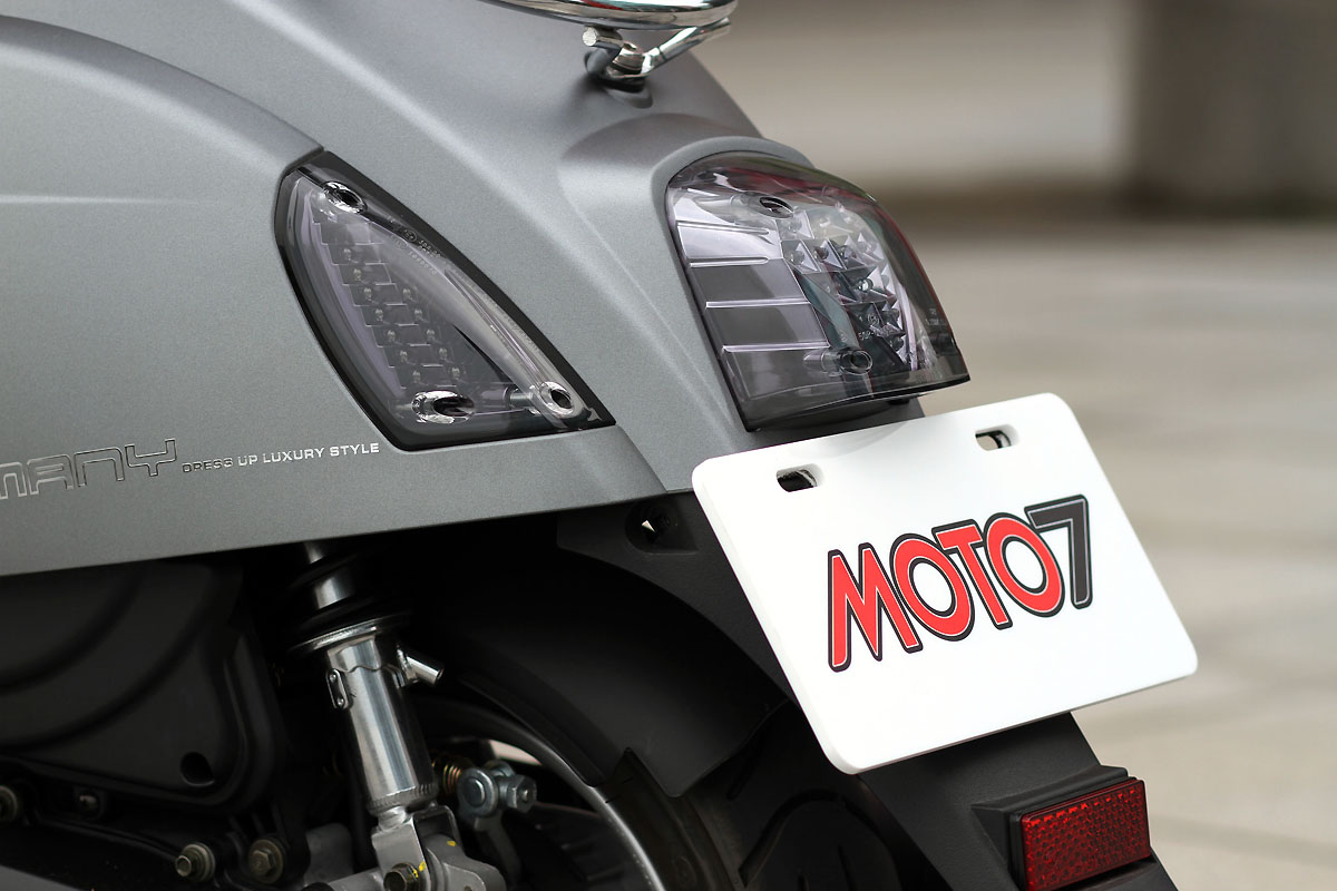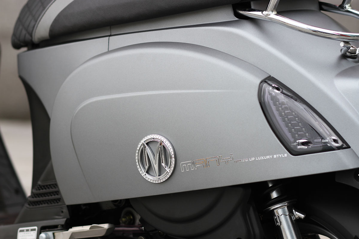 新款MANY110 水鑽版將原本車上的MANY 字體水鑽銘牌,全部改由新設計的MANY 專屬Logo 銘牌,在前斜板上的銘牌搭配施華洛世奇CRYSTAL ROCK 水鑽,車側殼所使用的銘牌則採用鏤空方式表現。原本採用銀色反光面的LED 方向燈,也改用更具質感的煙燻設計,能適度的平衡大量使用施華洛世奇水鑽元素產生的華麗感。原有的領帶飾板將MANY 字樣印花改成編織紋,除了更具質感外,也能和兼具舒適與美觀的雙色菱格紋坐墊設計相呼應,加強全車外觀整體感。