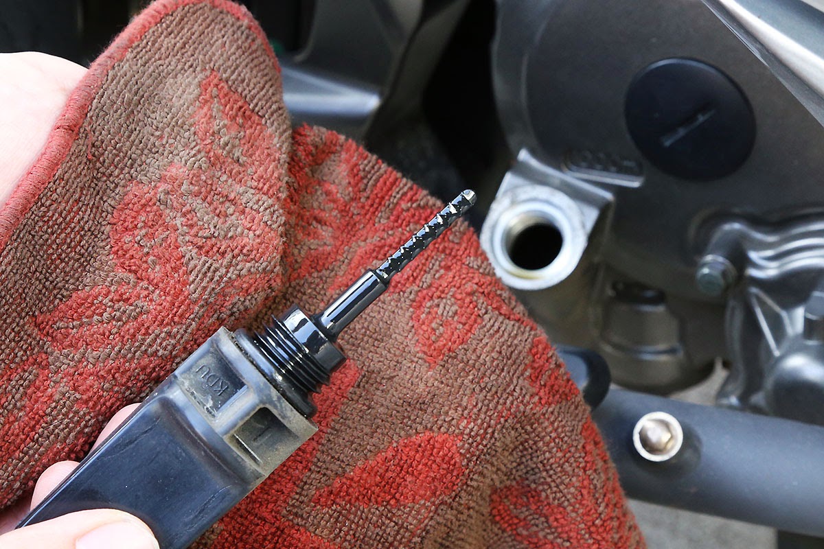 機油不夠時,引擎會因為潤滑不足而導致縮缸,雖然機油不像電系等其他配備會快速漏光,但是為了保險起見,上路之前還是要確實檢查,才能避免半路掛引擎的風險。檢查機油時,務必確認車輛停於平面、保持直立,才能正確檢查機油油量。原廠的機油蓋,可以直接用手轉開,機油蓋內所附的油尺即能檢查機油油量,先開蓋將油尺擦乾,再確實插回機油箱內,拿起時可看到機油沾附的高度,只要高於刻度2/3 就代表機油量仍在安全範圍內。
