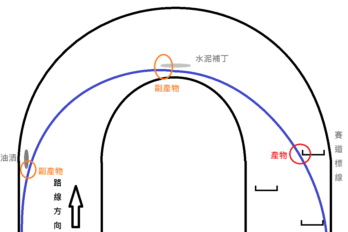 在彎道聖經中,作者將彎道的出彎點比喻成產物,你剎車點的選擇、APEX點的選擇、出彎開油門的選擇,就像是原料投入一樣,最後產出的產物就是你出彎時的位置。當你得到產物時,同時還會得到其他許多副產物,也就是彎中其他參考點,像是路線附近的水泥補丁、油漬、路沿石的缺角,這些副產物也是幫你確認你的路線的輔助工具,當你有足夠的產物與副產物時,你就能夠確實的清楚你在這個彎中的位置,讓你每次的路線都能夠固定下來,此時就能夠針對自己的路線改進,讓自己跑得更快!