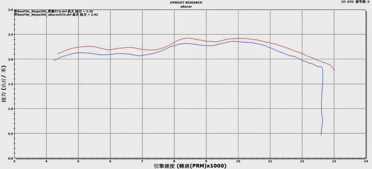 這台Ninja 300 幾乎掛載了aRacer SpeedTek 的全系列產品,包括最主要的RC2 ECU、雙AF1 寬域含氧感知器、iMode 供油點火即時控制與監控模組、DG-1 多功能顯示儀表以及aRacer 快排系統,這些配備讓原本就已經相當有競爭力的Ninja 300,整體效能有更好的輸出。在馬力機上所測試出來的結果,無論是馬力還是扭力,在所有轉速域中都全面向上提升,最大馬力比原廠電腦多了1.5匹,並且將整體出力向後延伸,高轉域馬力更增加3.5匹以上,最大扭力則從原有的2.36提升到2.42 kg/m,這樣的表現在數據中看起來僅是微幅提升,但實際測試時卻讓Ninja 300 擁有不一樣的個性!