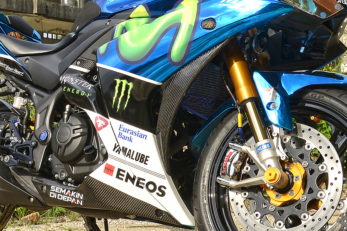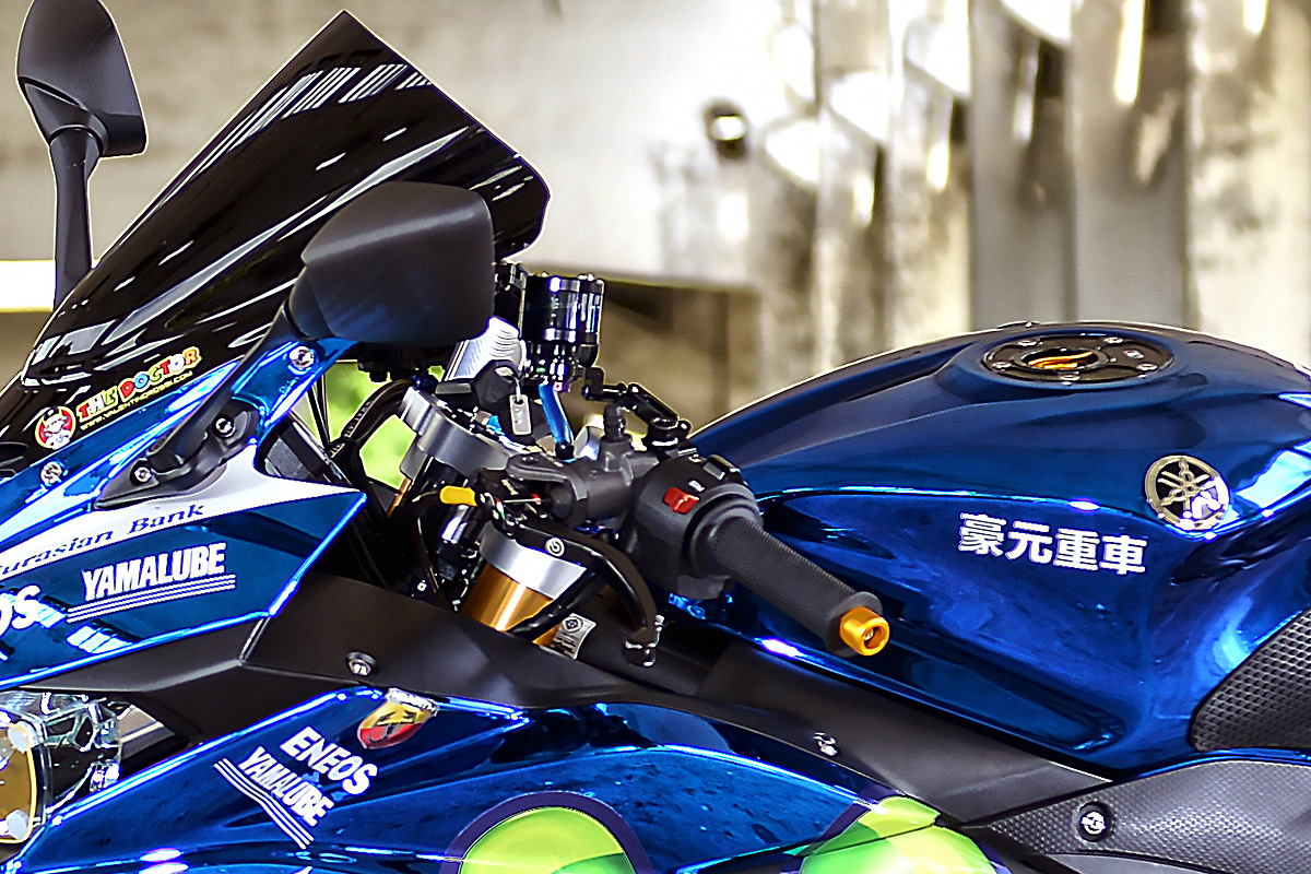 想要改進制動性能,不僅要改輻射卡鉗,還要一次上兩組!由於R3 原廠僅有單一邊的制動,於是店家移植了XJR 400 的前後輪框,前輪兩邊全部配上Brembo M50 對四幅卡,還加上OHLINS 倒叉,為了裝上這組精品,特別跟ZEUS Lighting 合作,客制CNC 三角台級分離把手,也讓原本較為RV 的騎姿更加接近仿賽!