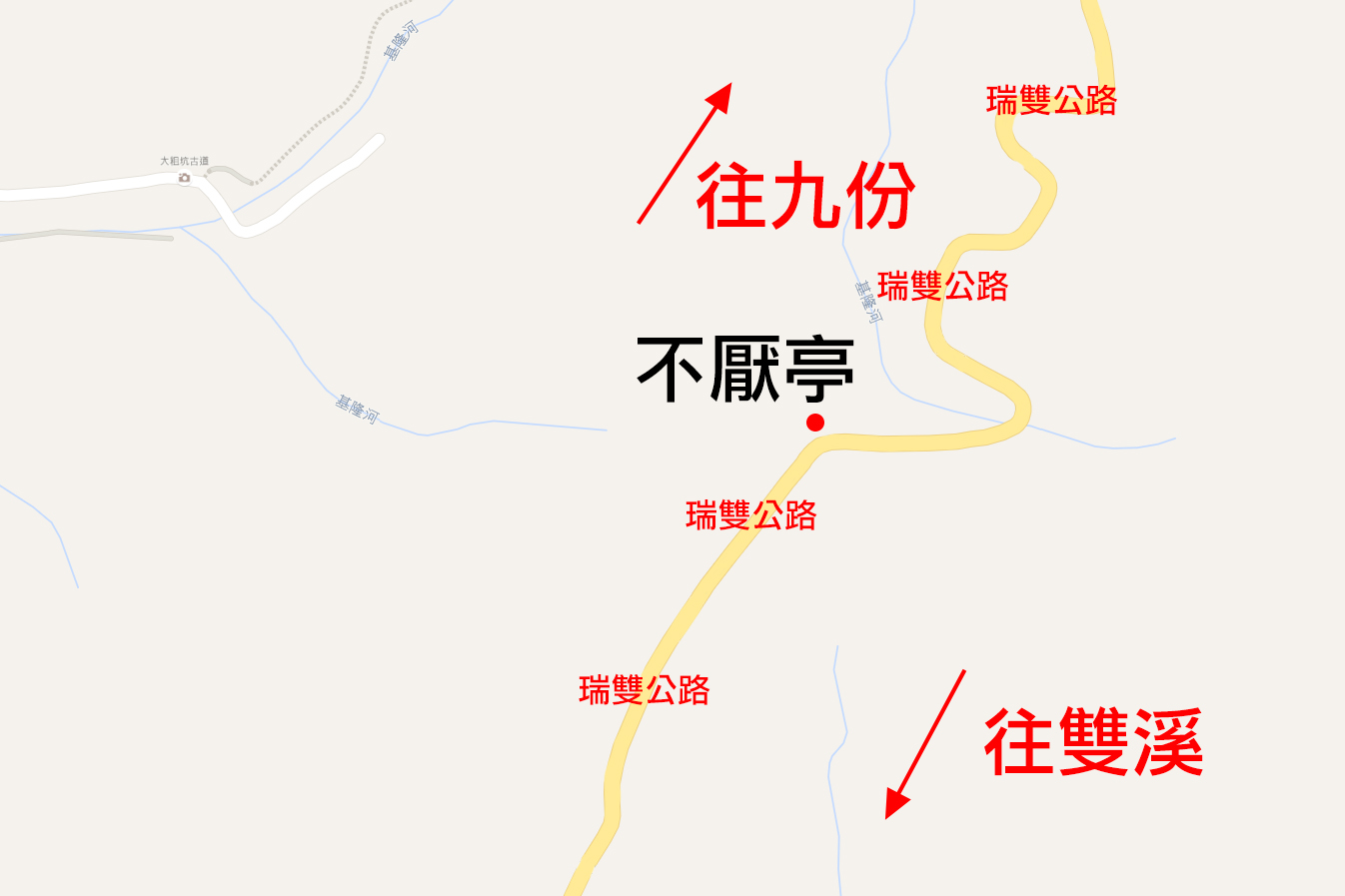 從106縣道轉往台2丙,再接上102縣道,也就是俗稱的「瑞雙公路」,瑞雙公路當年因為FORD LIATA 汽車廣告一炮而紅。廣告拍攝的地點,就是有名的「不厭亭」。
