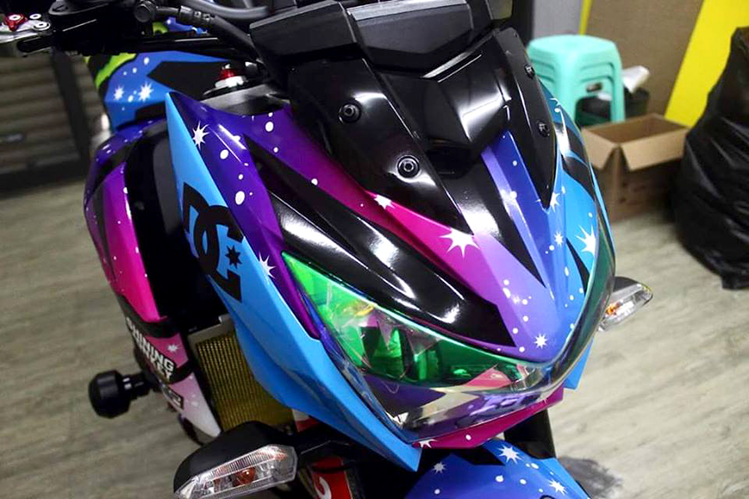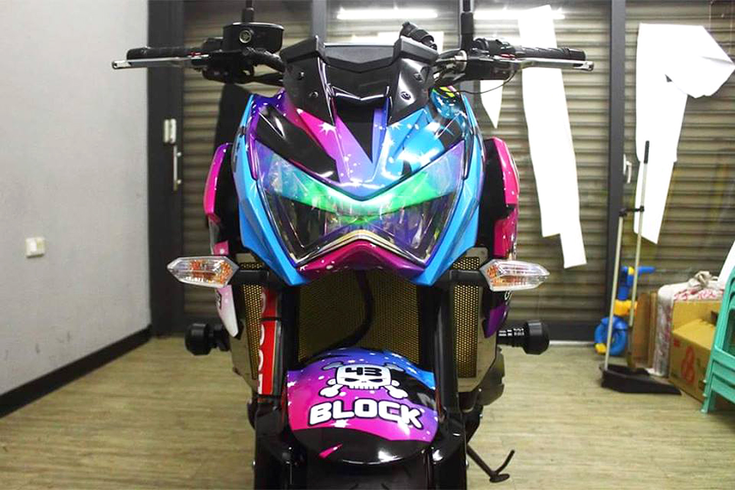 欣毅:剛入手這台Z800 的時候,車身顏色是KAWASAKI 經典的黑綠色。不過因為怕烤漆會有刮傷,就有了想要進行全車彩貼的念頭。製作彩貼的店家是GR-sticker-store ,和店家討論商量之後,就決定把彩貼上車了。