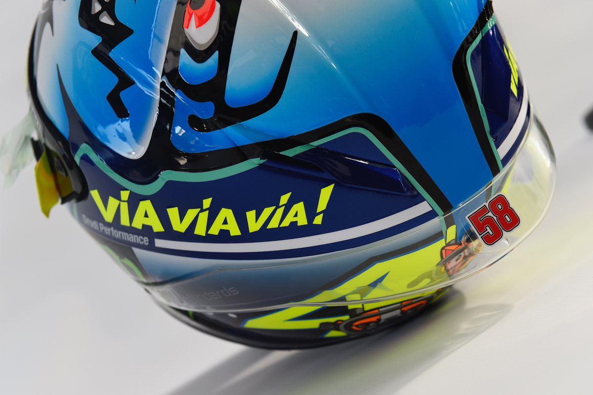 Rossi 去年在Misano 配戴的鯊魚帽,鴨尾貼上58以紀念Simoncelli。