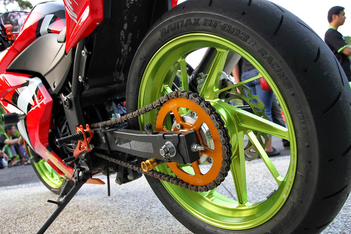 鏈條與齒盤所組成的傳動系統是當今最常見的,在仿賽車上幾乎清一色使用這一類型的傳動件。動力經過引擎及變速箱之後,便傳遞至驅動軸上的小齒盤(前齒),再藉由鏈條傳遞至後輪軸上被動的大齒盤(後齒)。小齒盤的齒數及大齒盤的齒數換算成減速比,因此鏈條及齒輪在搭配之後,動力還可以獲得一次扭力放大。