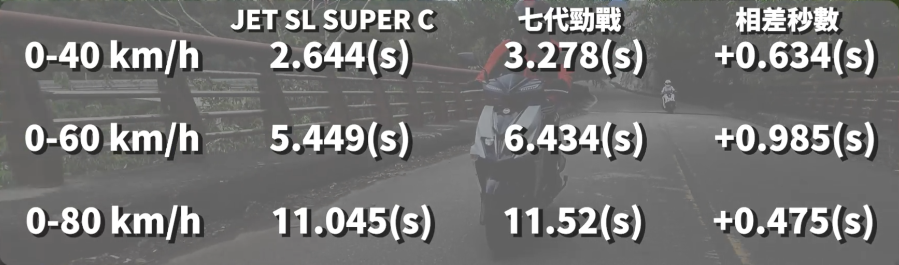 這將近半秒的差距,早在起步階段就已拉開。在 0-40 km/h 的加速中,JET SL SuperC 跑出 2.644 秒,而勁戰七代為 3.278 秒,JET SL SuperC 領先了 0.6 秒。這顯示出 SuperC 的電推在起步時發揮了極佳的作用,能在油門全開、轉速達到 4000-5000轉時迅速將車輛推射出去。