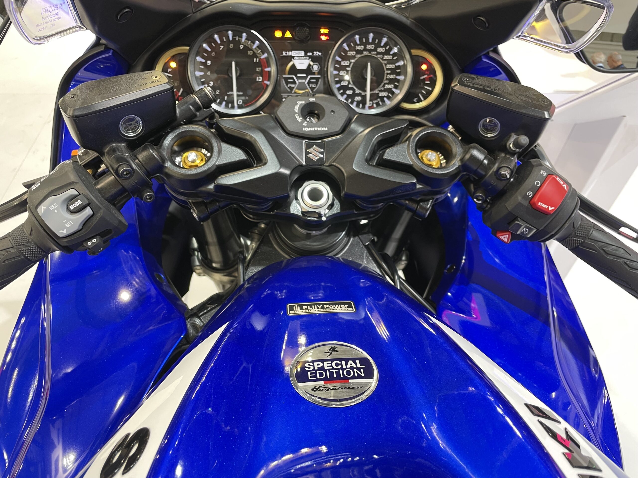 2026 年式 Special Edition 最引人注目的改變,莫過於其專屬的藍白配色(Pearl Vigor Blue)。這種配色並非隨意選擇,而是向 Suzuki 經典的賽事和高性能車款致敬,象徵著速度與純粹的運動精神。藍白相間的塗裝分佈在車身整流罩、油箱及尾部,視覺效果比起標準版的單色配置更加鮮明且富有層次感,進一步凸顯了 Hayabusa 獨特的流線造型。為了強化其跑車身份,特仕版將單座蓋列為標準配置(尤其是在義大利等歐洲市場),取代了後座,讓車尾線條更為簡潔流暢。